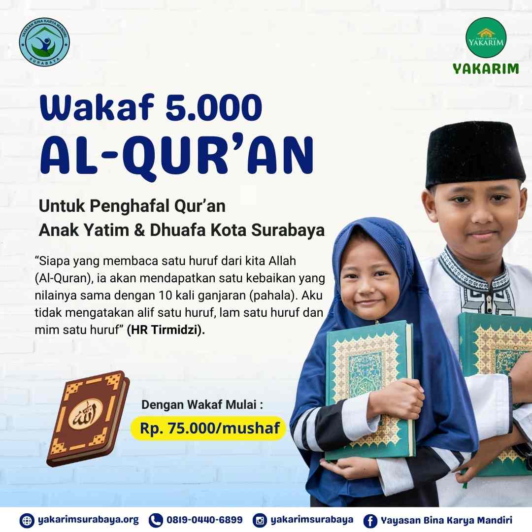 Melihat kegigihan mereka, Yayasan Bina Karya Mandiri (Yakarim) menginisiasi sebuah gerakan besar. Kami memiliki visi dan target mulia untuk mendistribusikan 5.000 Mushaf Al-Qur’an baru yang akan disalurkan khusus kepada anak-anak yatim dan dhuafa penghafal Al-Qur’an di seluruh wilayah kota Surabaya.